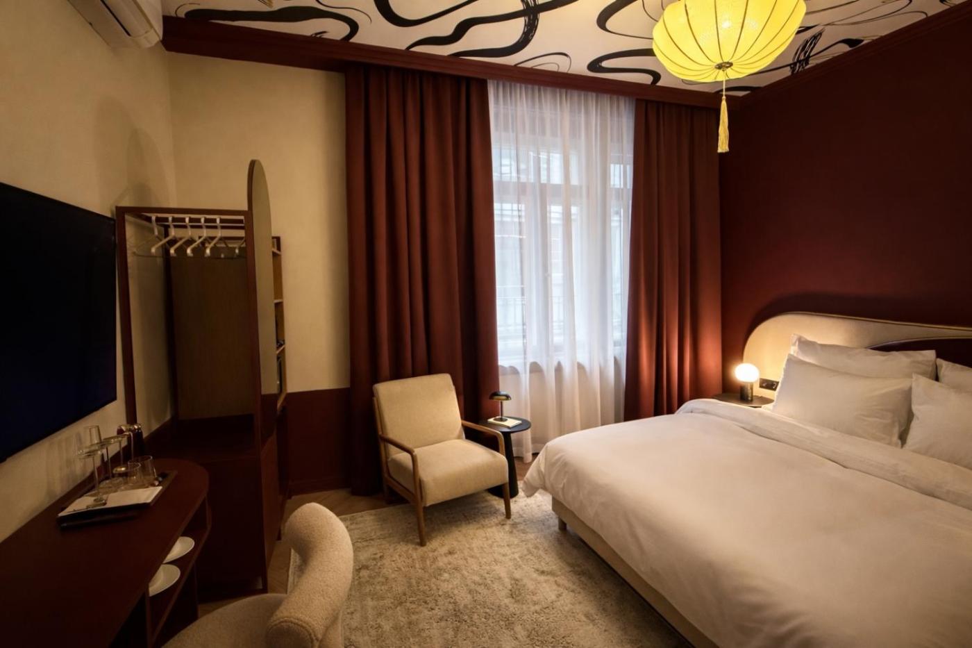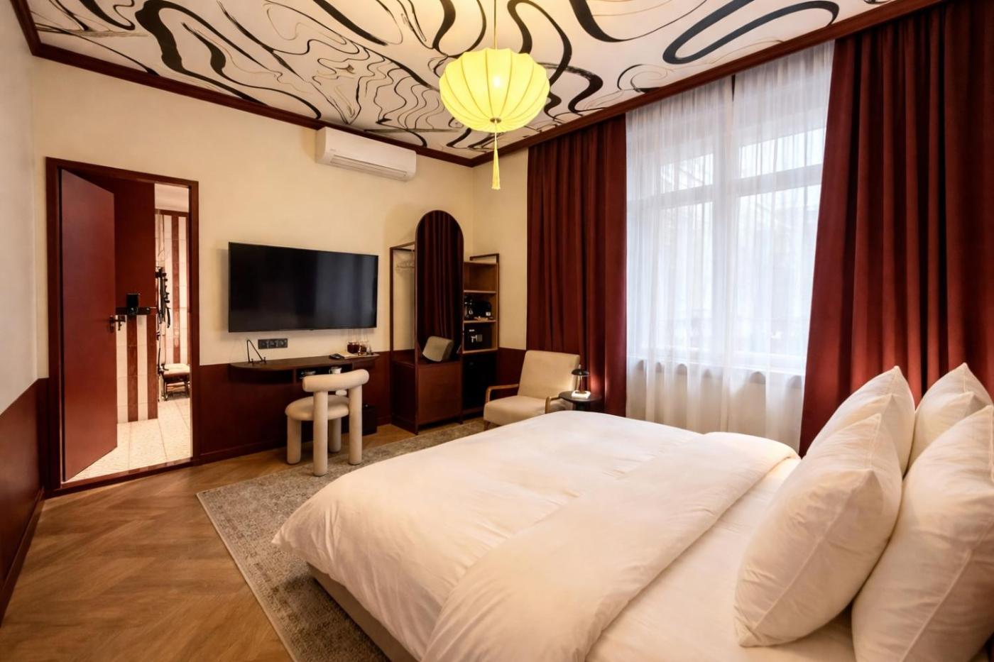 Deluxe King Room. The double room offers a wardrobe, a safe deposit box, as well as a private bathroom boasting a shower and a hairdryer. The air-conditioned double room features a flat-screen TV, a private entrance, a minibar, a tea and coffee maker as well as ancourtyard view. The unit has 1 bed. ;